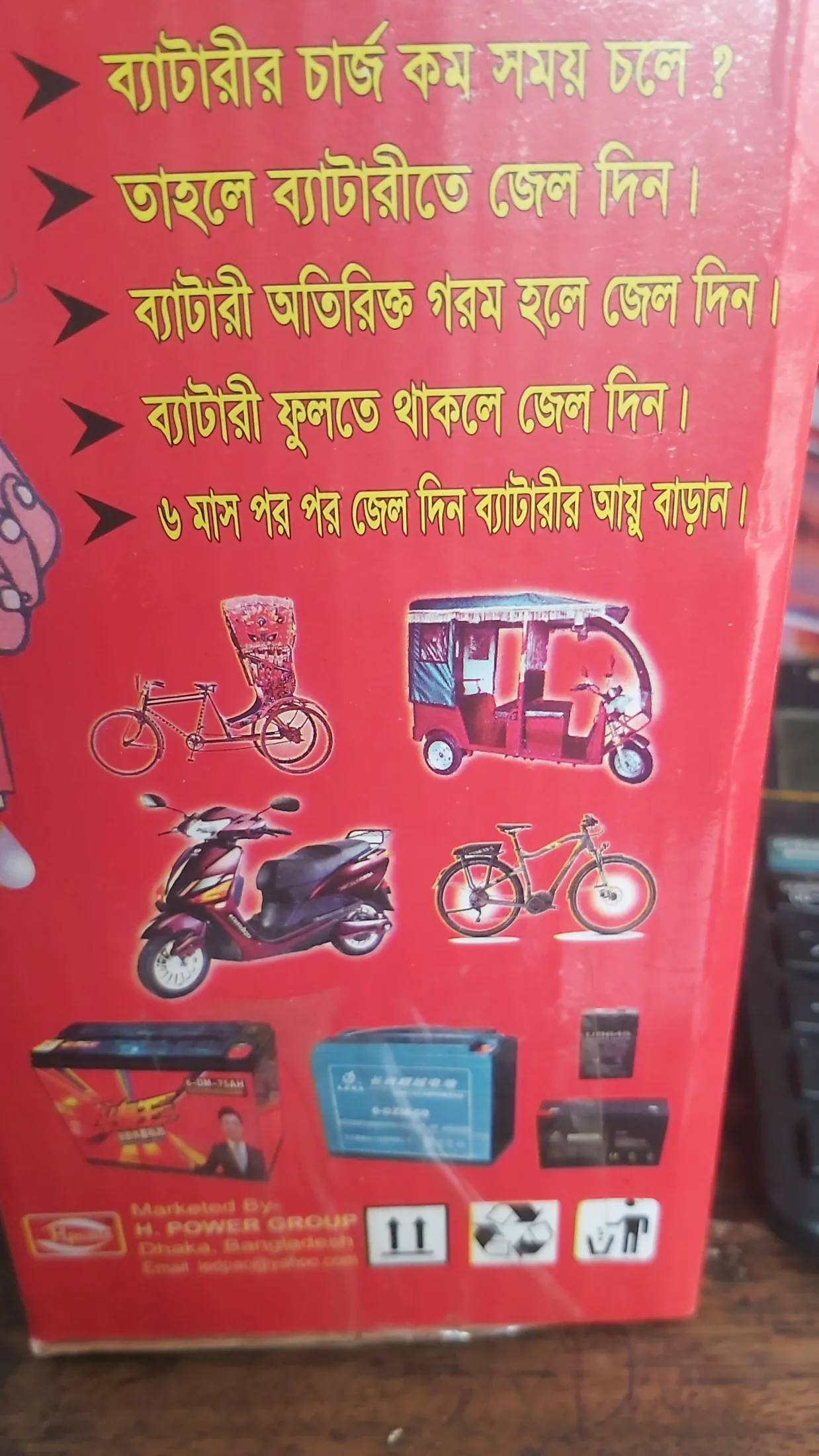 নির্দেশিকা : এই ইলেকট্রোলাইট জেল ব‍্যাটারীর তুলোর মধ‍্যে দেয়া থাকে। ব‍্যাটারী ব‍্যবহারের ফলে ধীরে ধীরে এই জেল শুকিয়ে যায়।ফলে চার্জ কম সময় থাকে এবং ৮থেকে১০ মাস ব‍্যবহারে ব‍্যাটারী প্রায় নষ্ট হয়ে যায়। এই সময় ব‍্যাটারীতে জেল ব‍্যবহার করলে ব‍্যাটারীর চার্জ প্রায় নুতনের মত থাকবে।ব‍্যবহার বিধি : ব‍্যবহারের আগে বোতল ঝাকিয়ে নিন। প্রথমে ব‍্যাটারী ভালভাবে চার্জ করে নিন। এর পরে জেল পরিমাণ মত দিন। জেল দেয়ার ১০ মিনিট পরে ব‍্যাটারীর ক‍্যাপ লাগিয়ে দিন। এরপরে ব‍্যবহার করুন।এই জেল ছোট থেকে বড়ো যেকোন আকারের ব‍্যাটারীতে ব‍্যবহার করতে পারবেন যেমন : চার্জজার লাইট, ফেন, মশা মারার বেট, ডিজিটাল পাললা, আইপিএস, ইউপিএস, অটো রিক্সা ব‍্যাটারীতে এই জেল অনেক ভালো কাজ করে